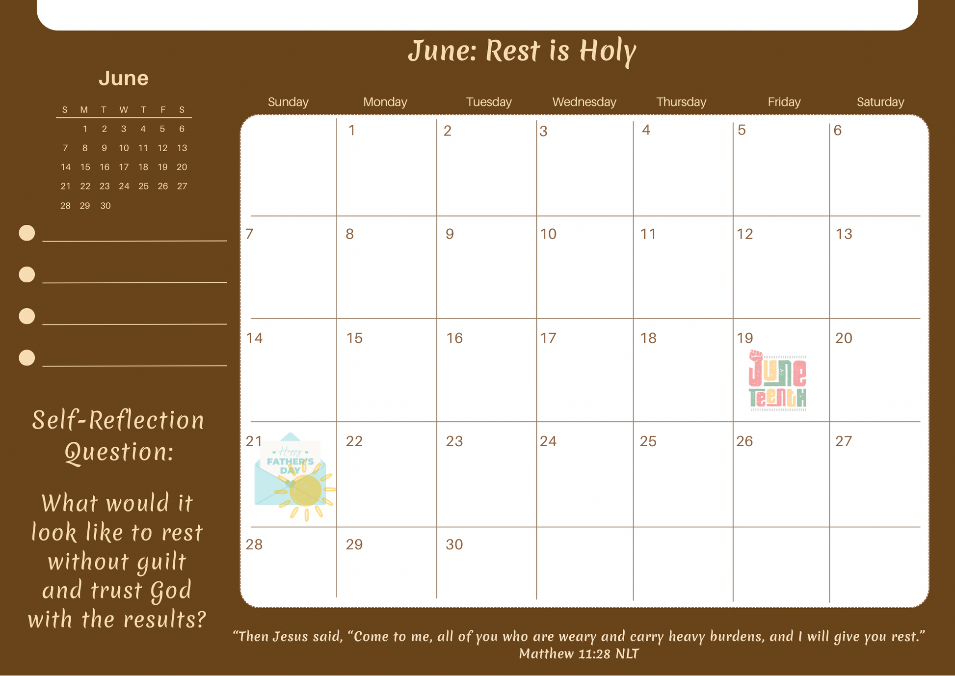 Each month includes thoughtful self-reflection questions to help you check in with your heart, your faith, and the season you’re in. It’s not about overplanning or doing more—it’s about becoming more grounded as you walk with God through the year.